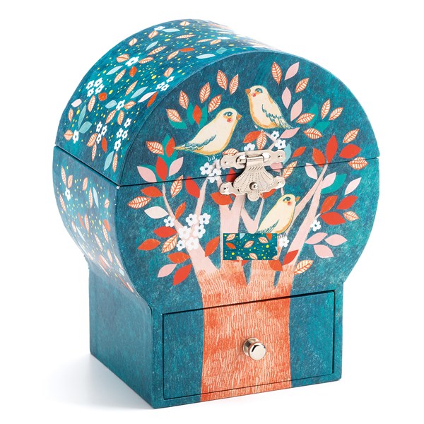 Arbre poétique est une boîte à musique silhouettée joliment illustrée avec un tiroir pour ranger ses bijoux et secrets. Tournez la clé, ouvrez la boîte et tout s’anime ! Une jolie figurine finement sculptée tourne et se reflète sur un miroir silhouetté au son de la musique « Santa Lucia » de Johann Strauss.