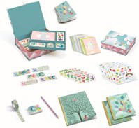 Coffrets cadeau remplie de papeterie pour écrire, dessiner ou créer à partir de 6 ans. Cette boite poétique comprend 10 cartes et 10 enveloppes illustrées, 6 planches de décalos, 6 marque pages, 6 planches de stickers, un rouleau masking tape, un crayon à papier, une gomme, 2 petits carnets à lignes et un grand cahier ligné. 22,5 x 18 x 6 cm