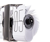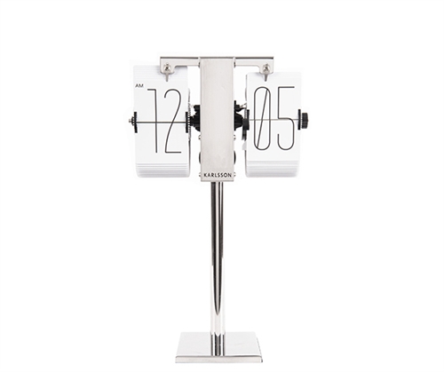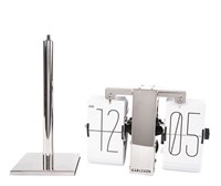 Horloge à clapet No Case Mini blanc, support chromé. 20,6 x 7,5 x 13,9cm. Horloge sur pied ou peut également être détaché pour la suspendre au mur. Vendu sans la batterie.