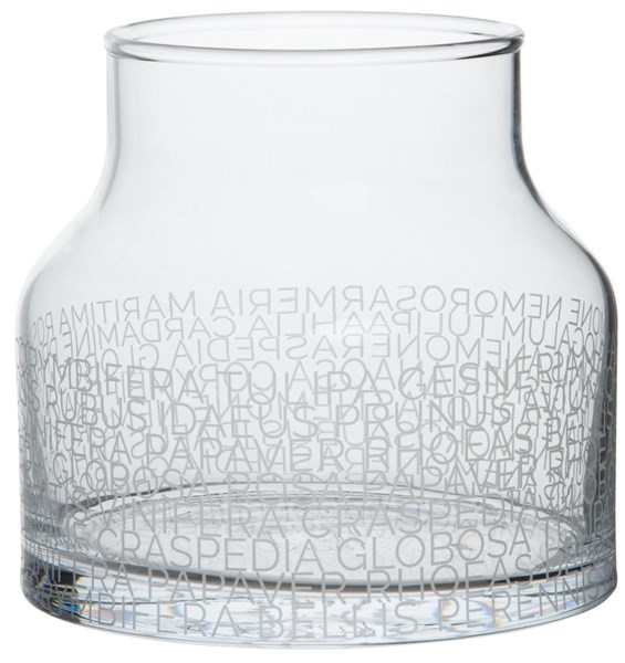 Vase en verre transparenr avec imprimé de noms botaniques. H:13cm dia:14cm