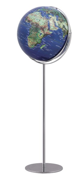 Globe de 43 cm de diamètre avec pied, base en métal chromé, hauteur totale 1,32m, carte topographique en relief, deux axes mobiles, plastique, métal, brillant