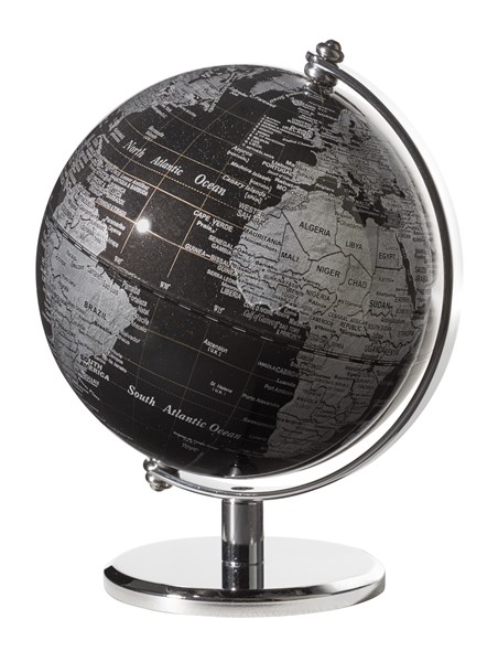 Globe de 13 cm de diamètre, base en métal chromé, axe mobile, plastique, métal, brillant.