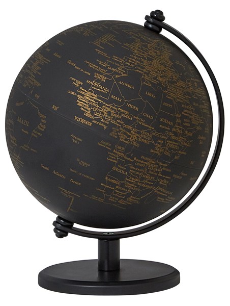 Le petit globe Gagarin au design classique est de haute qualité et repose sur un lourd cadre en métal. Le Globe de 130 x 170 millimètres avec sa base en métal chromé est en mat noir. Tous les continents, océans, pays, et les villes sont étiquetés en anglais.