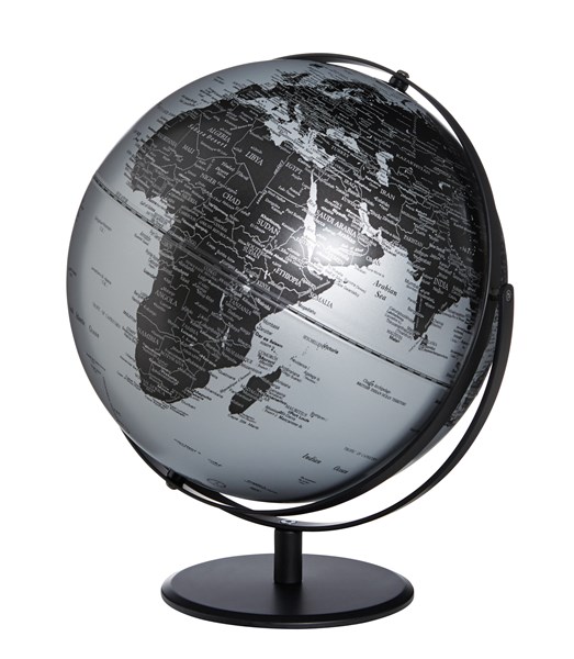 Globe de 30 cm de diamètre, base en métal chromé, deux axes mobiles, plastique, métal, brillant