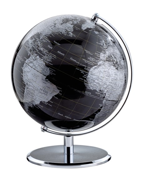 Globe de 25 cm de diamètre, pied en métal chromé, axe mobile, plastique, métal, mat