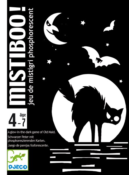 Mistiboo est un jeu de paires avec des cartes phosphorescentes et effrayantes... On peut y jouer dans le noir grâce à l'encre phosphorescente. C'est une version alternative du jeu Mistigri. Il vous faudra faire des paires pour vous débarasser de vos cartes, et surtout ne pas vous retrouver avec la carte Mistigri (ou plutôt Mistiboo) en fin de partie...