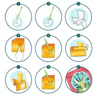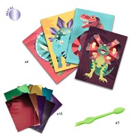 4 tableaux à décorer avec des feuilles métallisées. Grâce au code couleurs indiqué sur les planches, l'enfant repère les zones à métalliser. À l'aide de l'outil, il ôte la pellicule protégeant la surface encollée puis y dépose la feuille métallisée. La matière se dépose comme par magie et les tableaux s’illuminent.