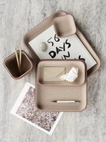 Dites adieu au désordre qui règne sur votre bureau, votre table ou votre étagère - et bonjour à une manière décorative d'organiser tout ce qui est nécessaire, des crayons, lettres et articles de papeterie au maquillage et aux accessoires de beauté. Le nouveau système de rangement Herba, conçu par l'Allemand Andreas Kowalewski pour blomus, se compose d'un ensemble de contenants polyvalents qui permettent des combinaisons personnalisées à l'infini, rendant ainsi facile et pratique le rangement de toutes les petites nécessités de la vie quotidienne. Les huit contenants Herba sont fabriqués en feutre, ce qui confère à leurs surfaces et à leurs coins un aspect légèrement incurvé grâce aux propriétés naturelles de ce matériau unique. De tailles différentes, les éléments de la collection s'emboîtent parfaitement les uns dans les autres, formant ainsi un ensemble magnifiquement unifié. Les différences de couleur subtiles entre l'intérieur et l'extérieur ajoutent à leurs formes douces et accueillantes, et les deux combinaisons de couleurs uniques - un beige classique/blanc doux et une terre cuite/sable discrète - vous permettent de trouver l'accord parfait pour votre intérieur.