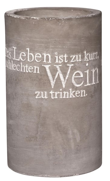 passionnés. Matière: béton, gaufré. Dimensions: hauteur 21 cm, Ø 14 cm. Texte en allemand: "Das Leben ist zu kurz, um schlechten Wein zu trinken".