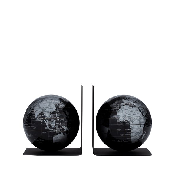 Le serre-livres se compose de deux éléments, chacun composé d'un un globe noir et argent. Les globes sont fixés par aimant ainsi ça nous donne la possibilité de les prendre pour mieux les contempler. Dimensions 1 globe H:15,5cm L; 13cm. Tous les continents, océans, pays, et les villes sont étiquetés en anglais.