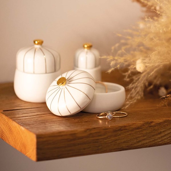 set 3 boîtes en porcelaine. Glaçure dorée. Dimensions entre: 4,2 – 6 cm, Ø 3,5 –5 cm