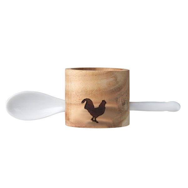 Set coquetier Chicken en bois d'acacia et cuillère en porcelaine. H:4,5cm dia:5cm cuillère l:14cm