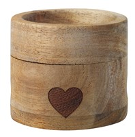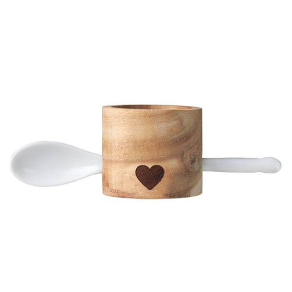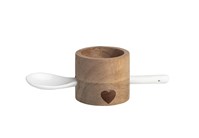 Set coquetier Heart en bois d'acacia et cuillère en porcelaine. H:4,5cm dia:5cm cuillère l:14cm