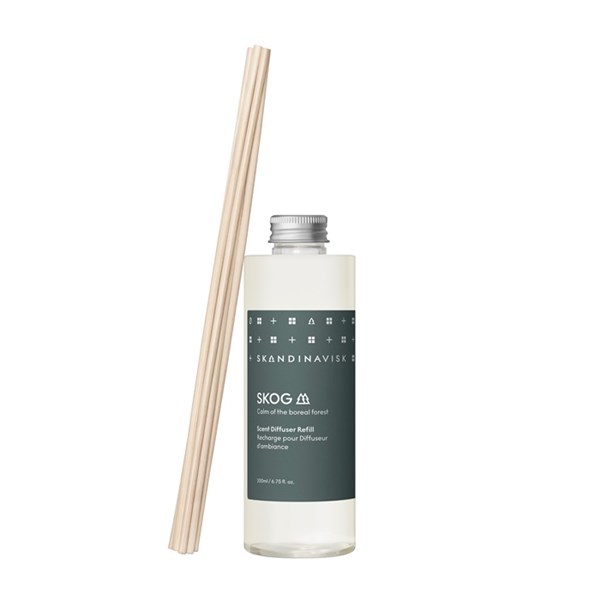 Respirez le calme de la forêt boréale. Notes de parfum: aiguilles de pin et pommes de pin, sève de bouleau et muguet des bois. Durée : + 3mois. Mélange de parfum avec de l'alcool naturel. Recharge 200ml + 8 bâtonnets inclus.