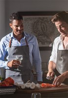 Tablier en denim avec des lanières 100% cuir. Fait à la main par des artisans qualifiés. Le look " washed" rend chaque tablier unique.